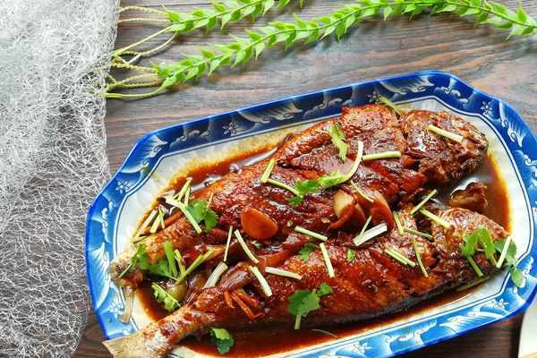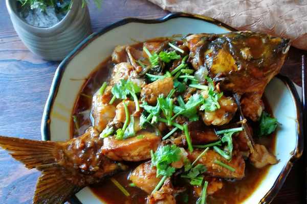 6.到時間後,把魚盛出放到盤內,把鍋內湯汁裏的葱段和大蒜,大料都撿出不要,加入醬油調色,大火把湯汁收濃一些,澆在魚上即可,撒上蔥花和紅椒。