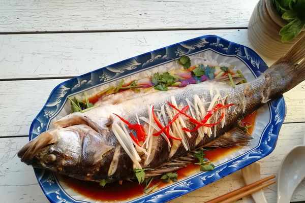 【清蒸海鱸魚】資料:海鱸魚1條、香菜1棵、紅椒1個、油鹽適量、葱1棵、薑1塊、蒸魚豉油3湯匙。料酒1湯匙、胡椒粉1茶匙、