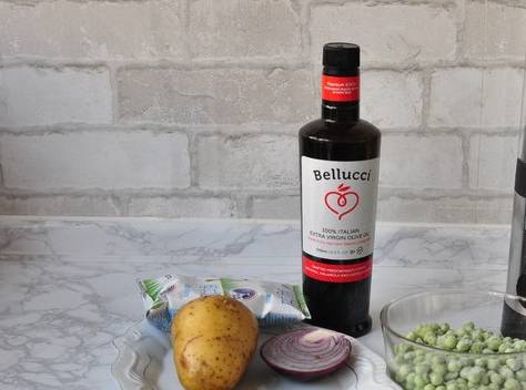 7.將土豆丁和豌豆丁放入鍋中略炒關火。