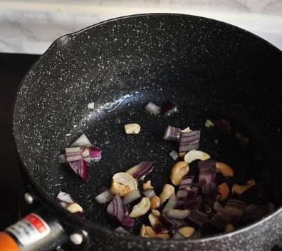 5.鍋中放少許橄欖油,先放入腰果煸成微黃