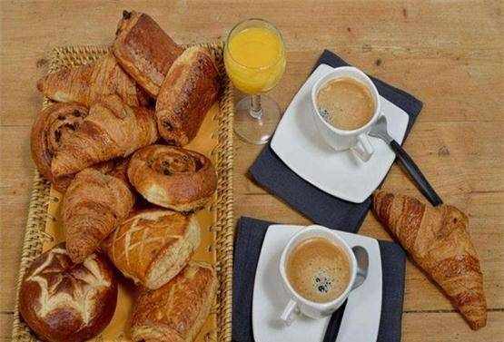 法國的早餐。主角就是法式小面包瞭,是不是覺得有點寒磣,其實這種其貌不揚的小面包味道非常可口,是法國人精心制作的,各種形狀都有。除瞭面包之外,還有濃咖啡和果汁。