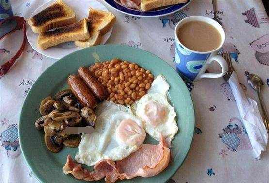 英國的早餐。蛋白質十分充足,有培根、煎蛋、小香腸、蘑菇和烤面包,營養完全能跟上,再配上一杯咖啡,絕對是一天極好的開始。