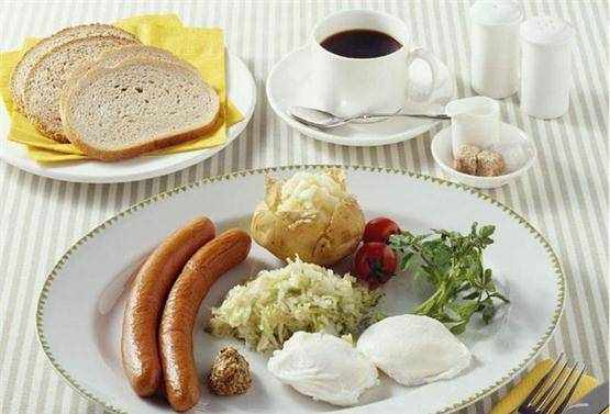 德國的早餐。德國除瞭啤酒之外,香腸也非常有名,是當地人最鐘愛的美食之一,在早餐中是必備之品。除瞭香腸和面包以外,其他的還有煮蛋、蔬菜沙拉、土豆泥、面包和咖啡,種類也不少。