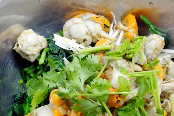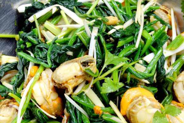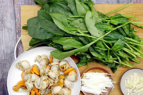 【所需食材】扇貝肉半斤、菠菜1把、大蔥、大蒜、香菜