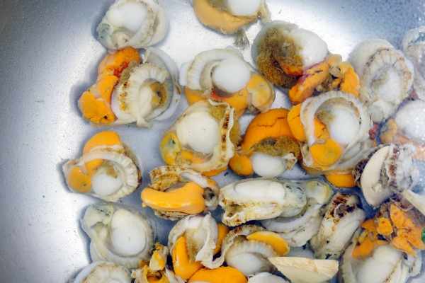 第三步:扇貝肉已經是熟的,用清水洗凈,下入加入少許料酒的沸水中,焯10秒撈出。