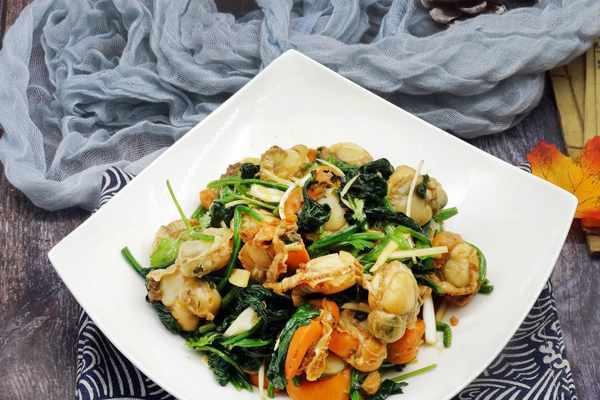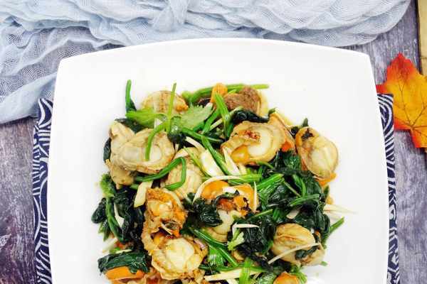 我經常給老婆用菠菜與海鮮一起做拌菜,用扇貝肉與菠菜拌,味道鮮美。