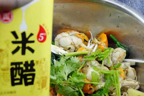 第六步:放入扇貝加入米醋、白糖、料酒、海鮮醬油。