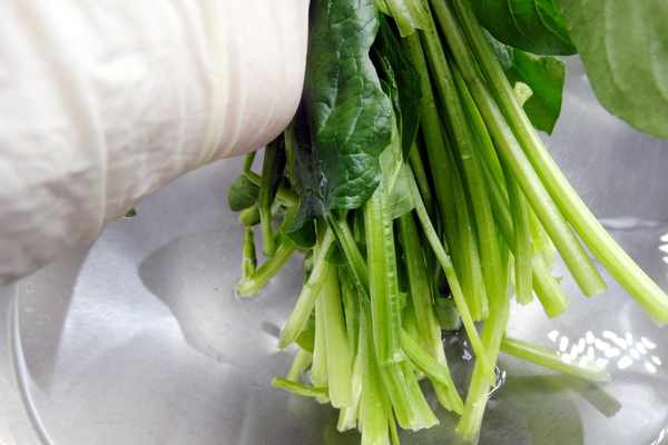 第二步:鍋內燒水,水開先將菠菜根焯燙10秒鐘後,再將整把菠菜下入水中,水開之後立即撈出投涼備用。