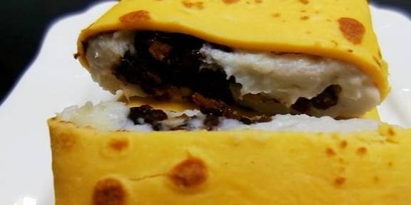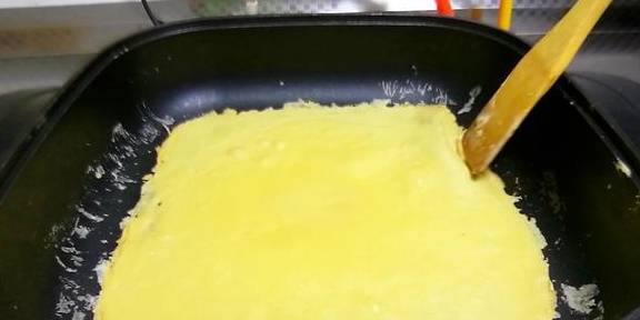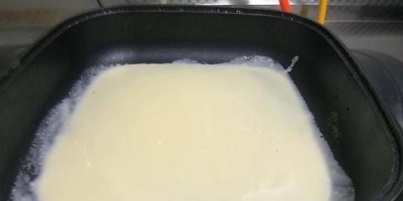 7、取一平底鍋把此時不要開火,也不用放油,把面糊倒進去,面糊不要倒太多,晃動平底鍋,讓面糊把平底鍋底部鋪滿鋪勻即可。