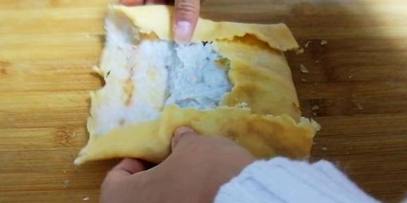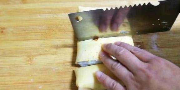 9、然後把餅皮取出放到案板上,在餅皮中間擠上適量的芋頭泥,然後倒上適量的豆沙,在豆沙上面再擠一層芋頭泥,然後將餅皮從四邊向中間折起,最後接口處朝下。