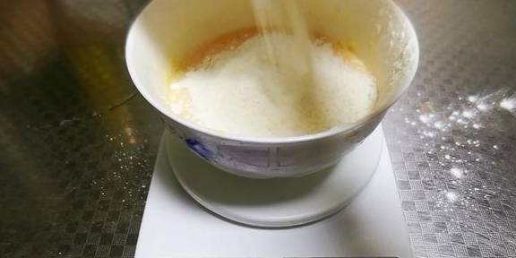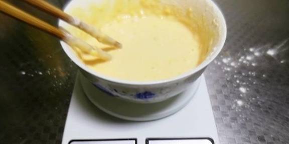 5、加入15克黃油,沒有黃油可以用玉米油代替,打入一個雞蛋,加入50克牛奶(註意牛奶如果是剛從冰箱裡拿出來的要溫一下,要不然太冰會讓黃油凝固起來),攪拌均勻,然後在倒入50克低筋面粉,攪拌成細膩的糊狀。