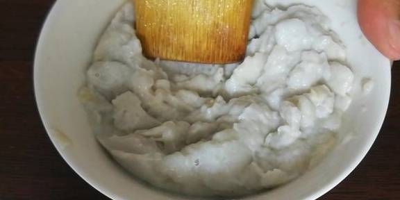 2、用鏟、勺子或是搟子,隻要是你用著方便的工具給搗碎,然後加入適量的牛奶和白糖攪拌均勻,成奶油那樣的粘稠度,把握不好量的話,牛奶一定要少量多次加入,避免加多瞭會導致芋頭泥太稀。