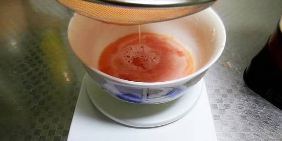 4、西紅柿切塊,倒入榨汁機,加一小勺水,榨出西紅柿汁,然後過濾一下,隻需50克就行瞭,如果嫌麻煩,可以直接用50克純牛奶或是泡50克奶粉水代替,如果使用沖泡的奶粉水一定要放溫瞭用,要不然後面加入面粉會燙成疙瘩的。