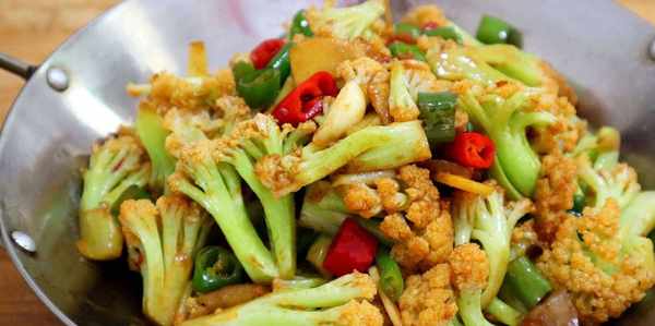 第五步,將花菜倒入鍋裡,翻炒上色均勻,加適量生抽,糖少許,雞精提味,翻炒熟,不要炒的太爛瞭,我喜歡吃清脆口感的花菜,如果喜歡吃軟爛口感,就需要多燜煮一會,最後將蒜苗倒入鍋裡,翻炒出蒜苗的清香,然後過火起鍋。