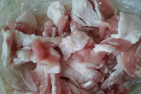 第三步,焯水後的五花肉切成片,油鍋加熱,將肉片倒入鍋裡翻炒出油,肉色改變。