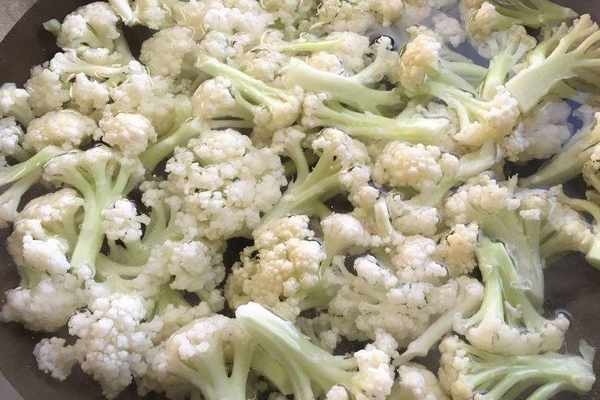 第二步,花菜切分成若幹個小朵,放入清水中浸泡,加入少許鹽,清洗幹凈備用,將辣椒全部清洗幹凈切成滾刀切備用,蒜切片備用。