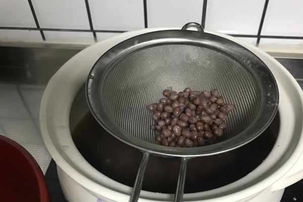 5、將其上述操作中的紅豆撈出來,用涼水可以清洗一下,這樣豆腥味就沒有瞭,不介意的話,可以忽略清洗的步驟,直接將其上述煮過的紅豆先撈出來待用即可。