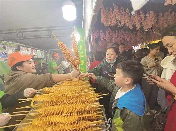 勁道的涼皮涼面,火熱的鐵板魷魚、烤面筋,酸爽的重慶酸辣粉、風味夾饃,奶香濃鬱的網紅竹筒奶茶、冰激凌……琳瑯滿目的各類小吃令過往行人忍不住停下腳步來上幾串、吃上幾個。