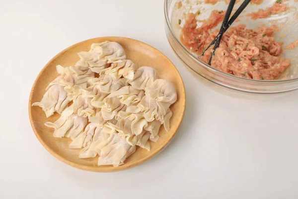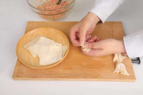 2.攪拌好的肉餡取適量,依次包入餛飩皮裡。