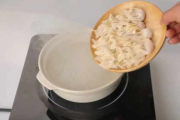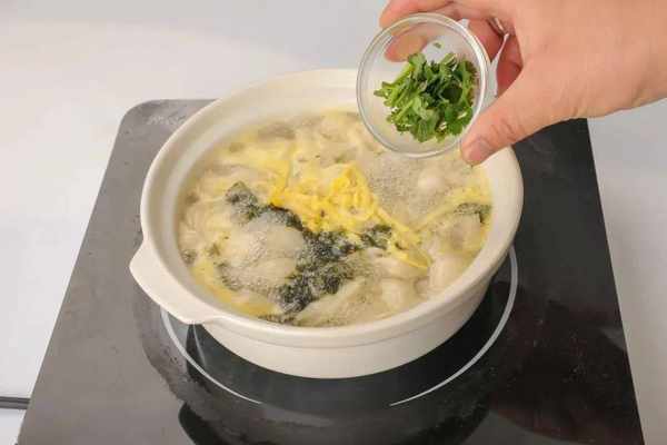3.鍋中加水,燒開後放入包好的餛飩,加入鮮雞汁8克、芝麻香油3克。