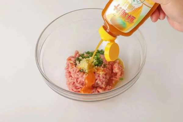 1. 先將蔥花、薑末、鮮雞汁5克、芝麻香油5克加入肉糜中攪拌上勁備用。