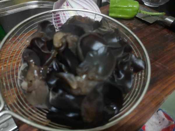 3. 黑木耳用清水沖洗幹凈,加入少許面粉,浸泡半小時,然後摘洗幹凈,焯水5分鐘,撈出放入冷水中;