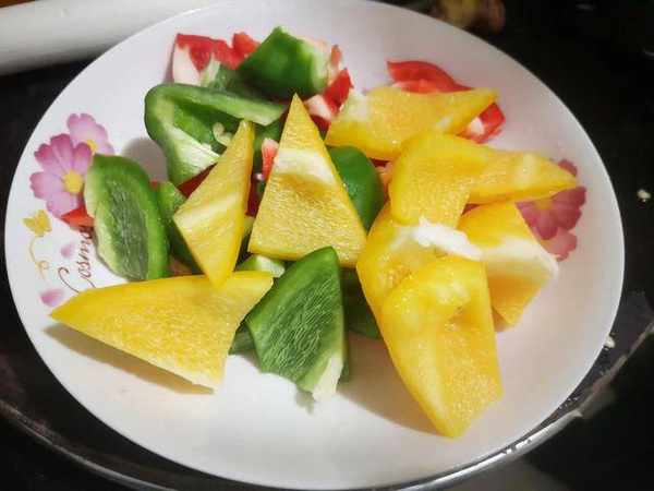 2. 把青椒、紅椒和黃椒清洗幹凈,切成小片,裝盤備用;