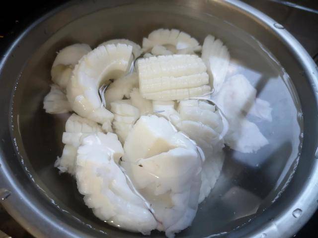 1. 把墨魚讓店傢清理幹凈,回傢再清洗一下,斜刀切成花刀,然後在加入黃酒的沸水裡焯燙30秒鐘,可以看到目魚塊很快就變成瞭漂亮的目魚花,撈出後迅速放入冰水裡面;