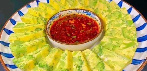 5、西蘭花雞蛋羹蒸好瞭。倒扣脫模,用刀從中間對半切開,再把它切成片,吃的時候再蘸上料汁,吃起來別提有多過癮瞭。