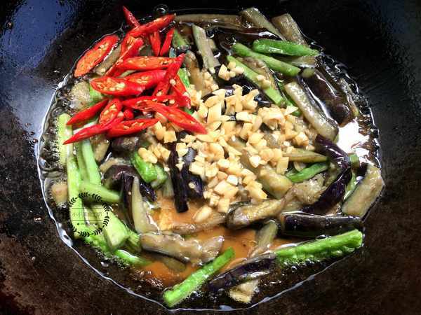 3、鍋中倒入適量油,放入攥幹水分的茄條炒至變軟,再倒入苦瓜翻炒均勻。
