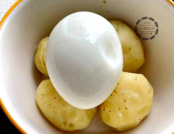1、將土豆和雞蛋清洗幹凈,放入蒸屜中蒸制成熟,然後剝皮備用。