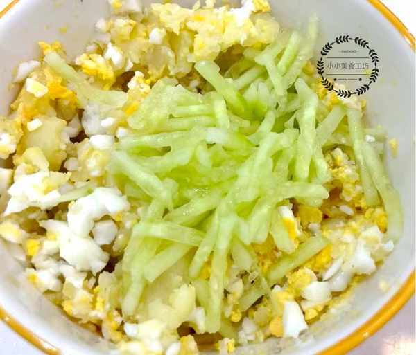 2、將土豆和雞蛋用叉子碾碎,加入少許黃瓜碎攪拌均勻。