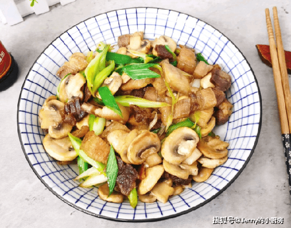 能將五花肉輕松紮透後撈出,瀝幹水分放涼。口蘑清洗幹凈,切成薄片。蒜苗洗凈,切成小段。