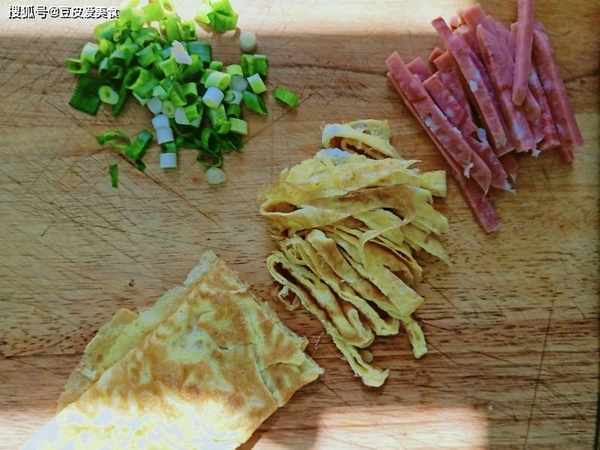 1、香菇洗凈,改刀切個十字花出來。杏鮑菇、口蘑和木耳切成絲備用。火腿切成條狀,小蔥切成末。