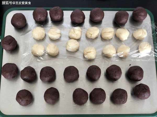 2、把面團分成15克每份的小面團,揉成球狀,用保鮮膜覆蓋好,防止幹皮。紅豆沙分成30克每份。