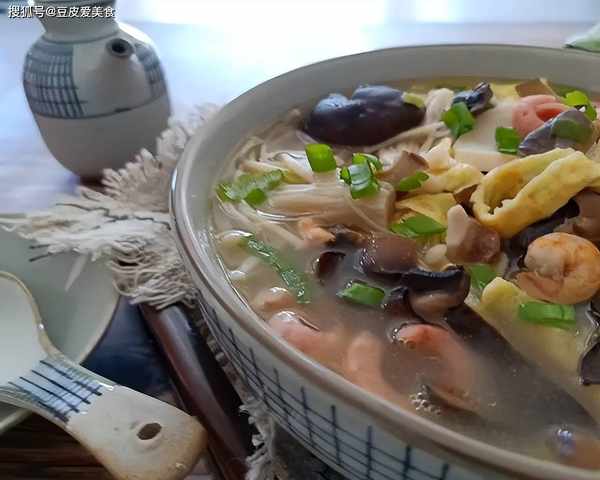 材料:杏鮑菇半個,蟹味菇適量,海鮮菇適量,香菇3朵,口蘑3朵,木耳5朵,金針菇適量,雞蛋1個,蝦仁適量,火腸1根,小蔥適量,雞精適量,鹽適量。