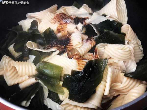 材料:海帶1盤,豆皮1.5張,蒜4瓣,老抽1勺,白砂糖半勺,郫縣豆瓣醬1勺,鹽適量,八角1粒,桂皮1小塊。
