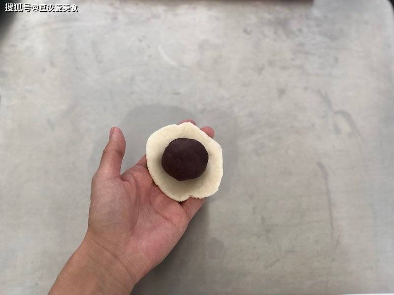 3、把面團用力搓一下,排掉氣泡,再搟成圓形薄片,中間放上一粒豆沙餡兒,收口,捏緊,收口向下放到烤盤裡,再用刮板輕輕按一下。