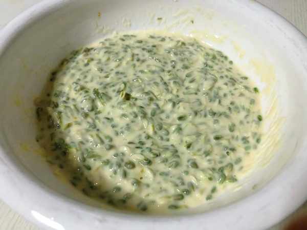 (3)接著少量多次的倒入面粉,攪成濃稠的槐花面糊,加適量鹽和味精調味