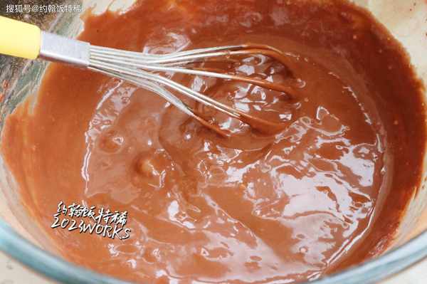 1:50克牛奶倒入無水無油的大碗中,加50克玉米油,用蛋抽攪拌均勻至乳化變成白色,篩入50克低筋面粉和10克可可粉,“Z”字型攪拌均勻,不能畫圈攪拌,以防面粉起筋,此時的面糊還是非常粘稠的。
