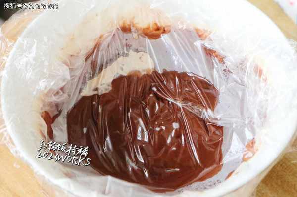 6:30克淡奶油+30克黑巧克力隔熱水融化,保鮮膜貼面冷藏至涼透。