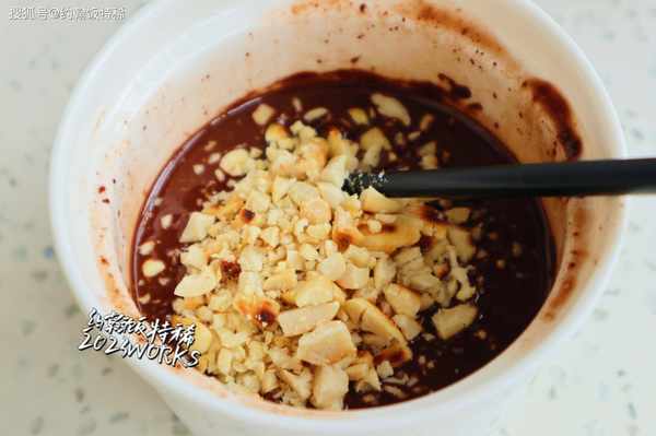 8:70克黑巧克力+30克子油隔水融化,倒入花生碎或者其它堅果碎攪拌均勻。