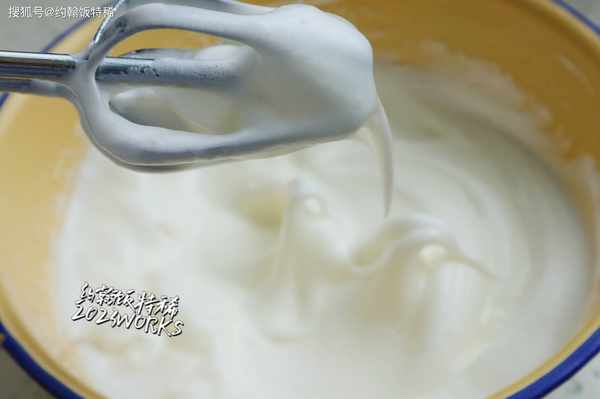 3:蛋清放入冰箱冷凍10分鐘,這樣打出的蛋白穩定性更好,直到盆的邊緣有少許冰渣取出,裡面擠上少許檸檬汁,加入30克細砂糖,打發至提起打蛋器有小彎鉤的狀態。