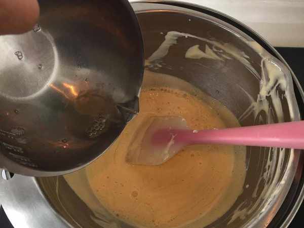 7、加入隔水融化的丁片攪拌至均勻。(如隔水融化丁片的水高於50度會影響蛋糕凝固。)