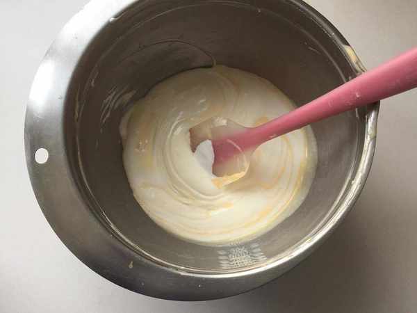 9、將混合好的百香果糊分三次與打發的淡奶油翻拌均勻。