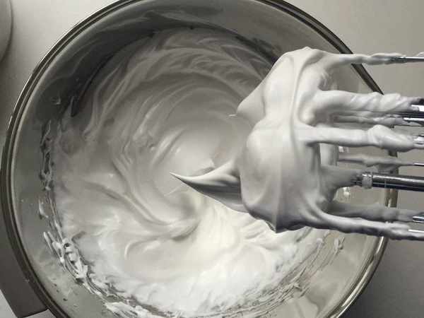 2、將烤箱預熱上下管145度。蛋白中倒入檸檬汁,用低速打至粗泡加三分之一糖。這時改為高速蛋白打到微尖加第二次糖。第三次同時加入細砂糖。打到9成發不用打到過於幹性。