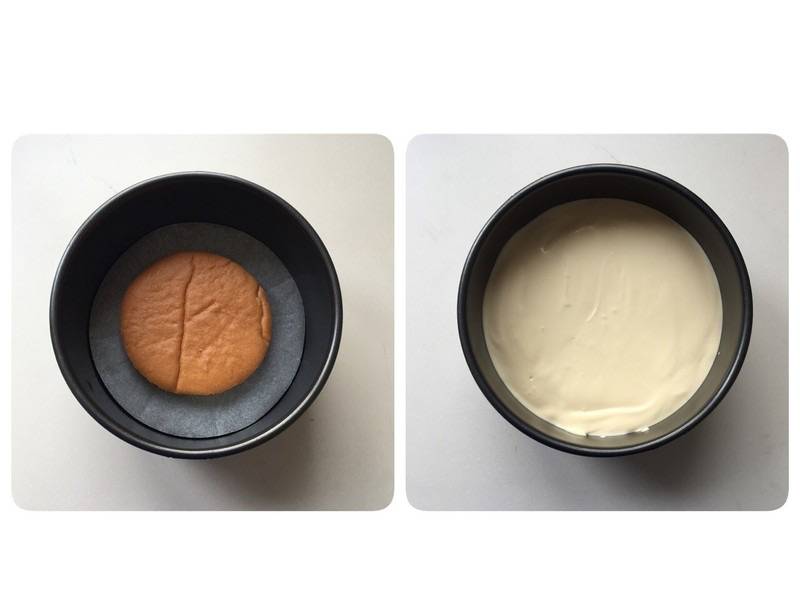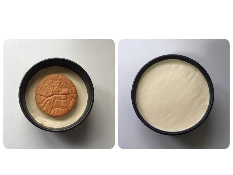 10、模具中放入小於6寸模的蛋糕片。倒入一半量百香果慕斯糊震模入冰箱冷凍5分鐘左右。(一半量的慕斯糊可分兩次倒入避免蛋糕片浮起)