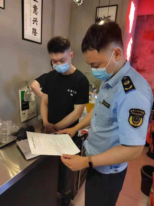 在這傢新開業的餐飲店,執法人員從主體資質、環境衛生、原料采購、餐飲具清洗消毒、明碼標價等方面開展全面檢查。