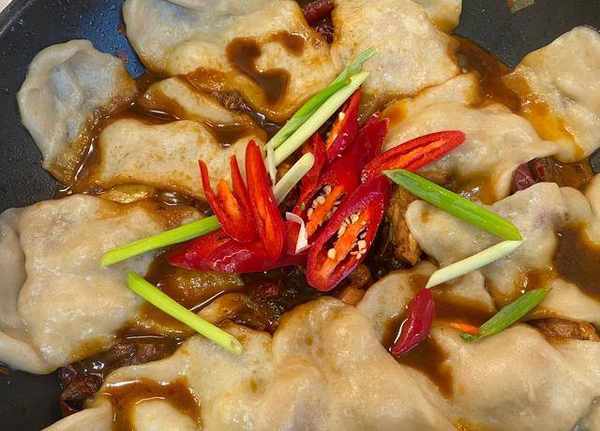 8、將泡好的小面劑子扯開,一一碼在鍋壁上,然後小火十分鐘將餅燜熟;最後撒上辣椒蔥花煮兩分鐘即可