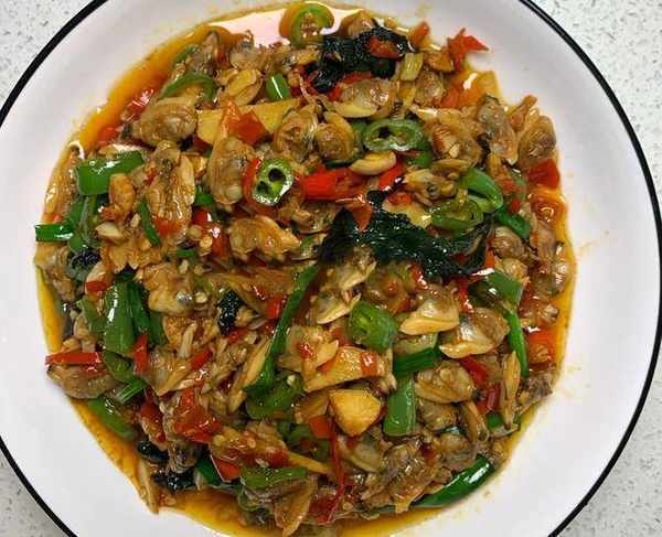 2、鍋中倒油,放入紅辣椒,蒜,泡椒,薑片,蔥頭,剁椒炒香後加入花甲肉翻炒均勻